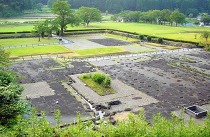 朝仓家第5代家主朝仓义景的居所遗迹,占地约有6500㎡,三面都被土垒与护城河包围。内部常御殿、主殿、会所、茶室、日本最古老的花坛以及厨房、马厩、仓库等建筑物井然有序。位于东侧山脚下的馆迹庭园中建造了强有力的瀑布石造景、护岸石造景,从简约的石头造景中可以感受到此地与京都的文化交流往来