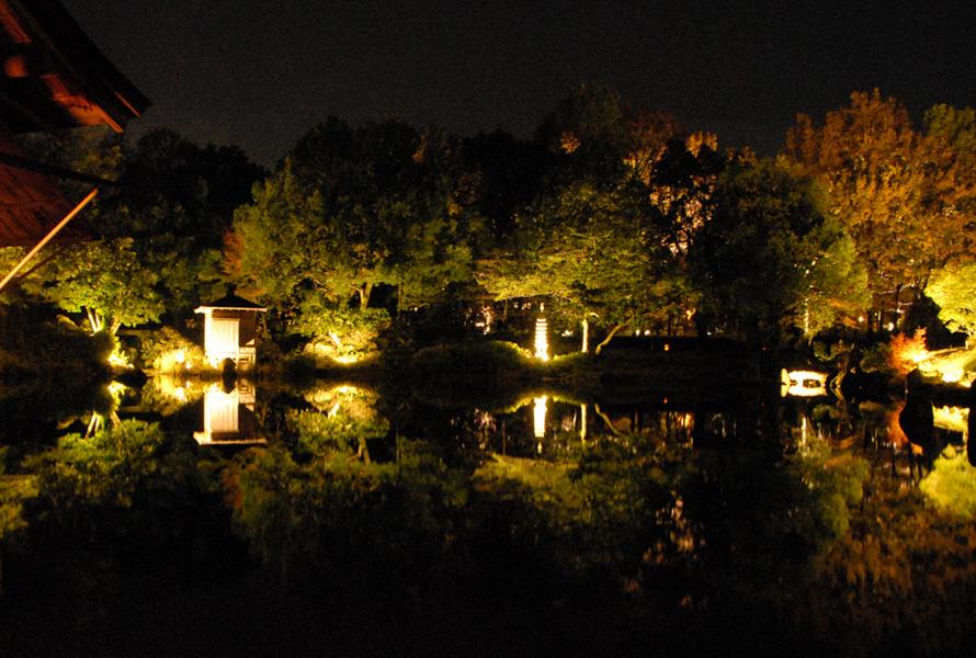 Genießen Sie von Mitte Oktober die Herbströte und die dekorative Landschaft der Bäume mit hochgebundenen Ästen (Yukitsuri) um sie vor der Schneelast zu schützen.