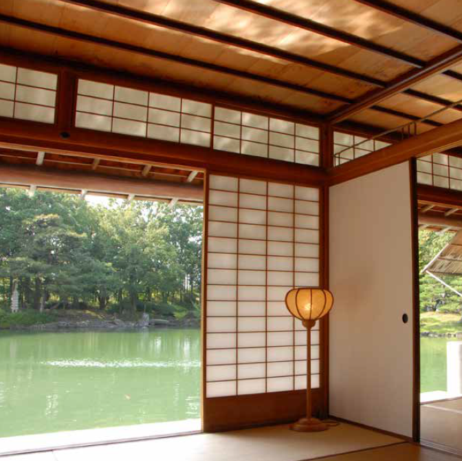 With the garden extending an additional 9 meters to the east at that time, the east and south openings allowed the lords to enjoy the view of the garden stream. Today, we can still enjoy the view of the gentle stream flow on the pebbled shoreline and a natural stone bridge.