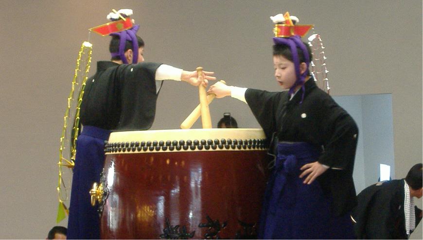 덴가쿠오도리는 첫 순서인 무풍(舞風)의 독무가 펼쳐지고, 다음에 화립(花笠)을 쓰고 빈자사라(타악기의 종류)를 든 4명의 춤 등이 이어집니다. 다아소비는 무대에 큰 북을 설치하고, 그것을 치면서 두 명의 다유(상급 배우)에 의한 다아소비 주창과 주위 공연단의 장단을 맞추는 노래가 교대로 반복되며 진행됩니다.